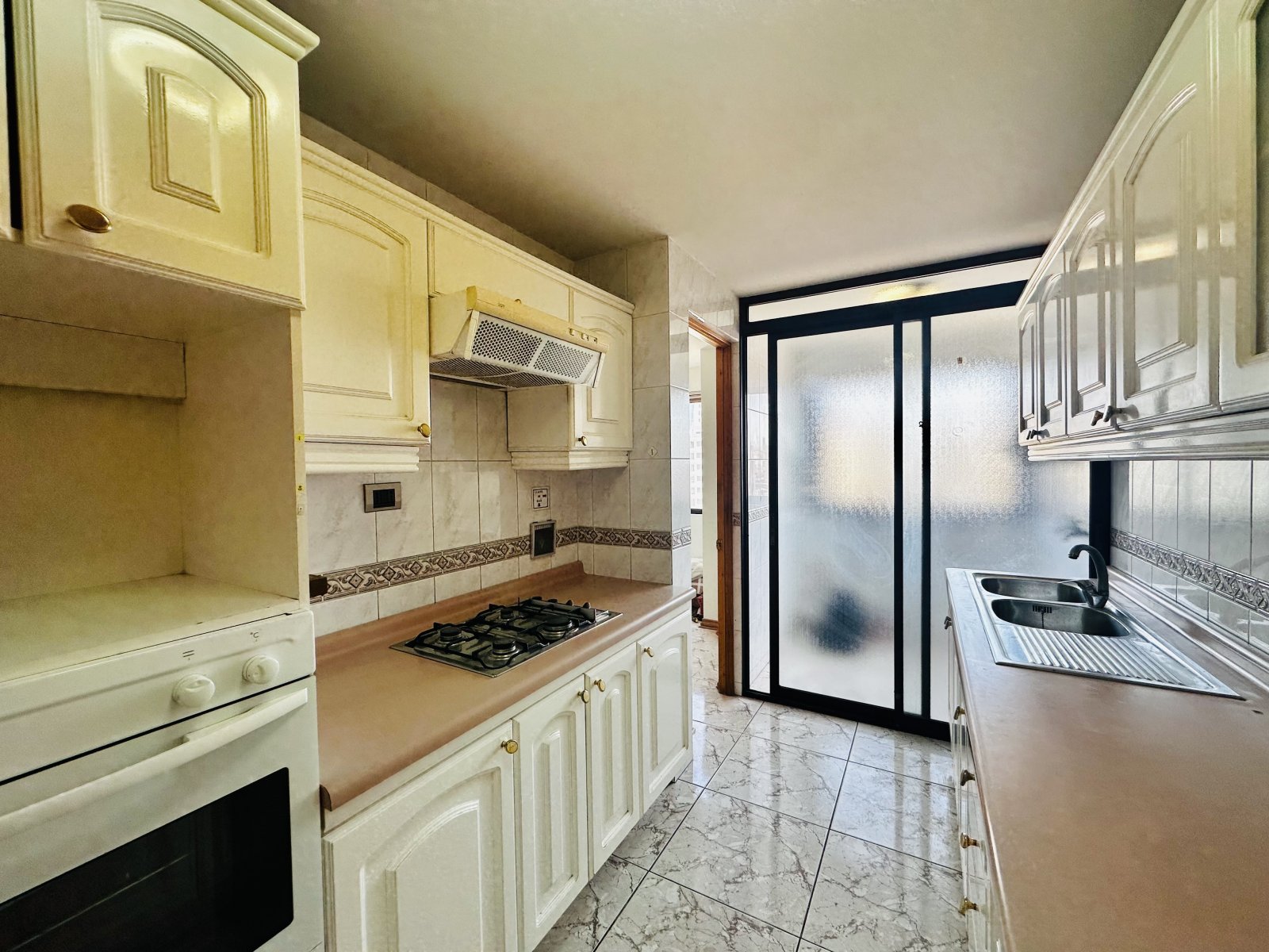 Cocina cómoda y amoblada, vinculada a una logia amplia  y dormitorio de servicio con baño propio . Total 3 baños, incluyendo el de servicio.